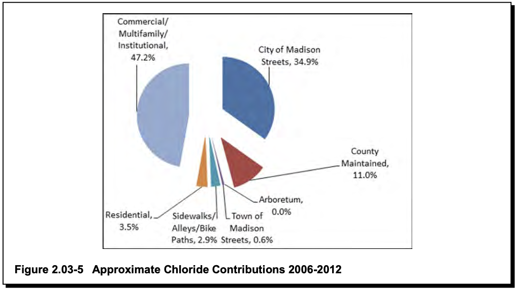 The largest contributors of salt in the Lake Wingra watershed are shown in the table below summarized in the figure below.